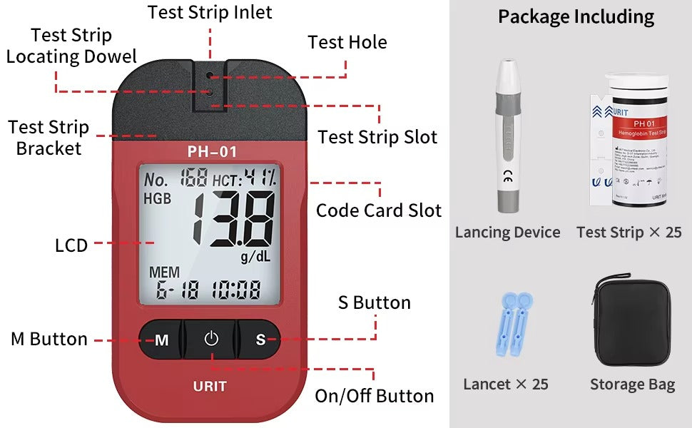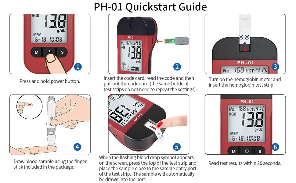 Compatible with PH01 Hemoglobin Analyzers only. Store in a cool, dry place away from direct sunlight. Results are for reference purposes only — consult a healthcare professional if readings are abnormal.